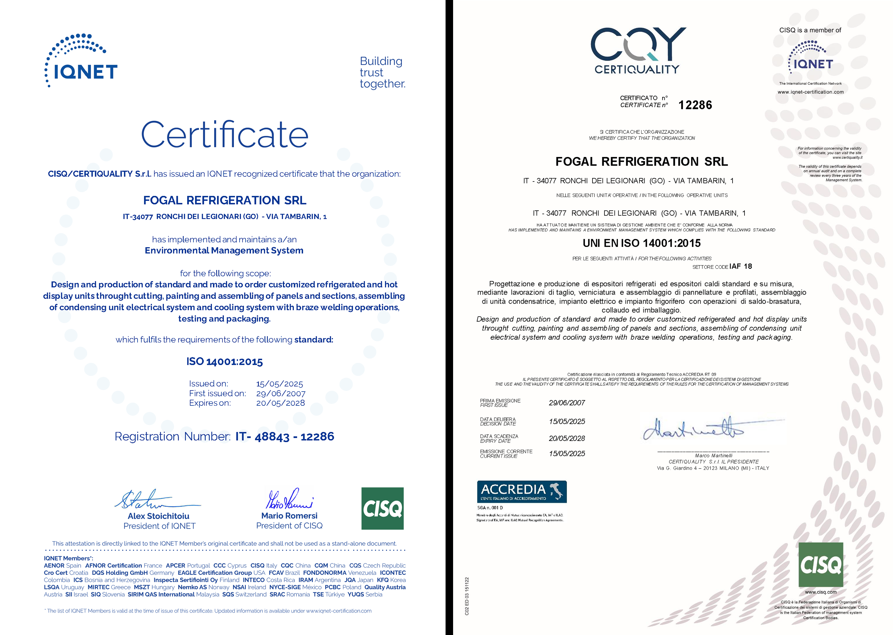 Depuis 1980 l’entreprise Fogal Refrigeration s.r.l. a été caractérisé par son engagement d’amélioration continue, tant en ce qui concerne la qualité du produit offert que la qualité des lieux de travail et les impacts environnementaux. La Direction compte adopter comme stratégie de base la satisfaction du Client, qui doit être poursuivie par l’adoption de la Qualité Totale comme modalité habituelle de gestion et par la meilleure manière d’organiser les ressources disponibles, tant humaines que technologiques. Elle est également consciente de la responsabilité de l’Entreprise pour la protection de l’environnement et de la santé et sécurité des travailleurs. Un Client satisfait est le résultat d’un procédé qui a été capable de mettre à disposition du Client un produit conforme aux exigences et aux contraintes établis (par le Client lui-même, par les Normes, par l’Organisation). Pour ces motifs, par le biais d’une évaluation du cadre dans lequel elle opère et par l’identification des besoins de ses principaux parties prenantes, l’Entreprise a implémenté et tient à jour un système intégré de gestion environnementale, de contrôle de la qualité et de protection des travailleurs conforme aux normes UNI EN ISO 9001 :2015, UNI EN ISO 14001 : 2015 et UNI ISO 45001:2018.